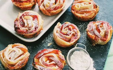 - Milföy hamurunun boş yarısını mascarpone ve şeftalilerin üzerine kapatıp, gül şekli vermek için soldan başlayarak nazikçe yuvarlayın. Kalan şeftaliler ve hamur şeritleriyle aynı işlemi tekrarlayın.